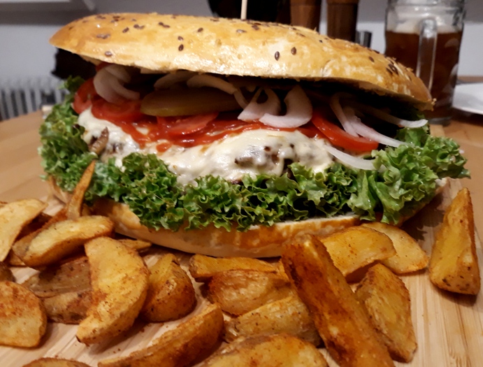 - Nun das Pattie auf das vorbelegte Burgerbrötchen geben und die restlichen Toppings darüber platzieren. Zum Schluss die Salsa Sauce und ein wenig Salsa Salat auf dem Pattie platzieren und mit der Oberseite des Burgerbrötchens alles leicht zusammendrücken, damit sich die Salsa gut verteilt. Den Spies mittig durch den Burger stechen und schon ist er servierbereit – Guten Appetit.